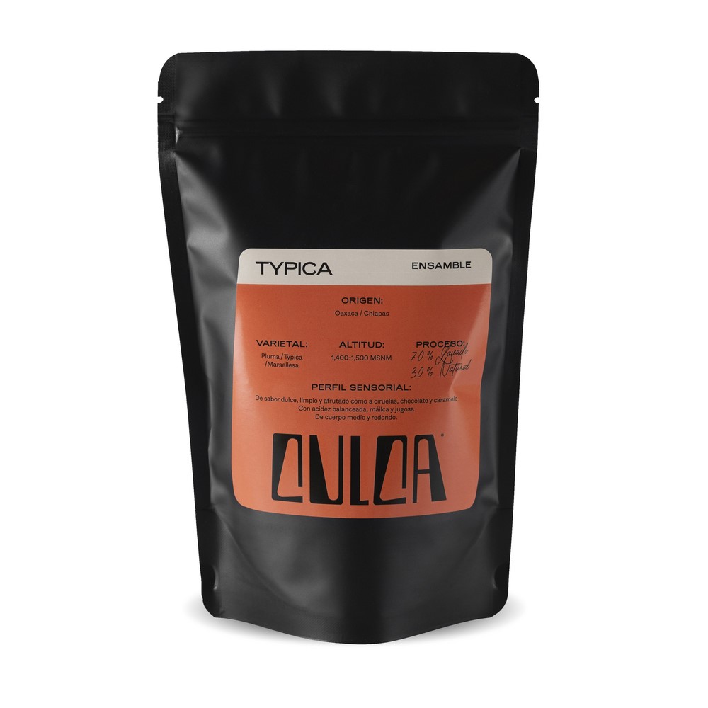 Región: Ensamble Origen: Oaxaca, Chiapas Varietal: Pluma, Typica, Marsellesa Altitud: 1,400 – 1,500 msnm Proceso: 70% Lavado, 30% Natural Perfil Sensorial: De sabor dulce, limpio y afrutado como a ciruelas, chocolate y caramelo. Con acidez balanceada, málica y jugosa. De cuerpo medio y redondo.